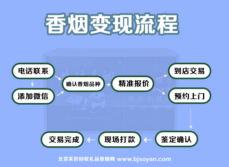 香烟变现流程: 添加客服微信(13260026553)或电话→确定香烟品种→真实报价→到店交易或预约上门→鉴定确认→现场结款→交易完成。